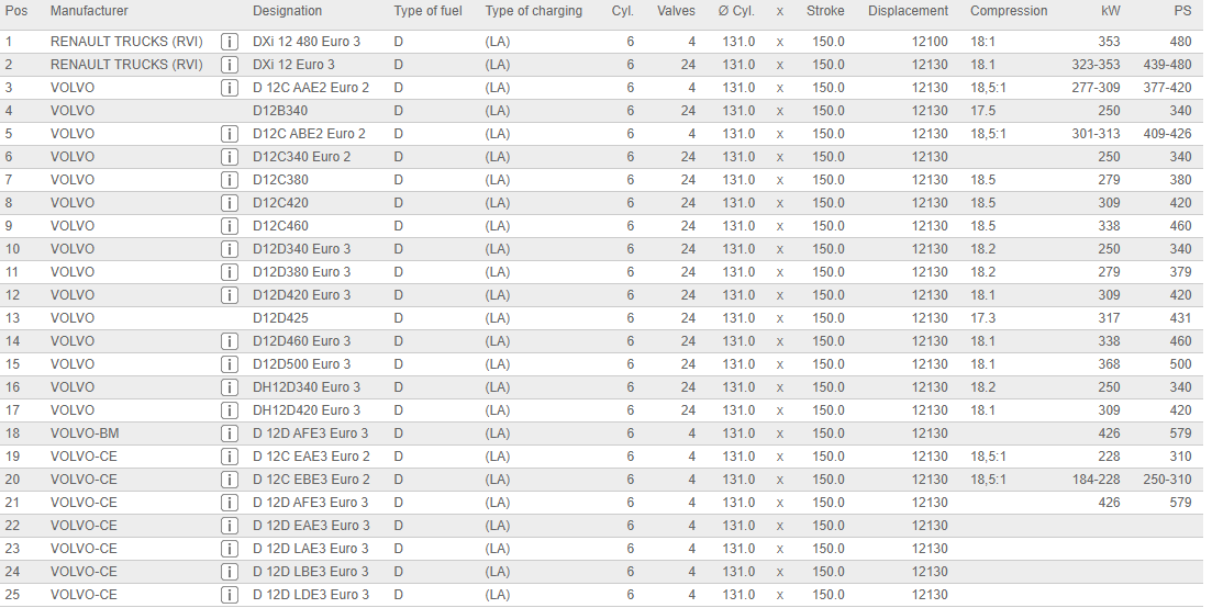 این قطعه که محکم و از جنس فولاد است، داخل سوراخ های بوش سیلندر به شکل عمودی حرکت می کند. پیستون ها در اندازه و قطعات مختلف با توجه مدل موتورها تولید می شوند. یکی از انواع آن، پیستون موتور FH12 دو تیکه است که مناسب برای انواع موتور های D12 بوده و در رنو تراکس RVI، ماشین سنگین ولوو، لودر ولوو بی ام-BM و بیل مکانیکی ولوو سی ای-CE استفاده می شود.